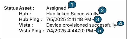 Displays the current status of the asset, hub, and Vista device assignments. Indicates whether each component has been successfully linked and provisioned.