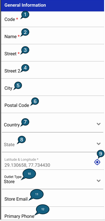 | Latitude & Longitude | The geographic coordinates of the Outlet. The GPS icon can be tapped to refresh and retrieve the latest coordinates based on the current GPS location. |