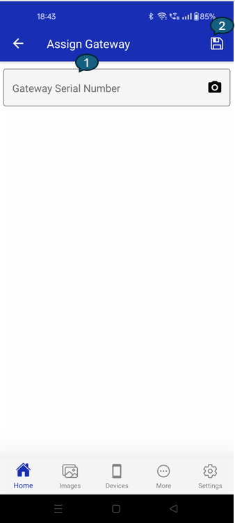 Enter the gateway serial number manually or tap the camera icon to scan the barcode for quick entry.
