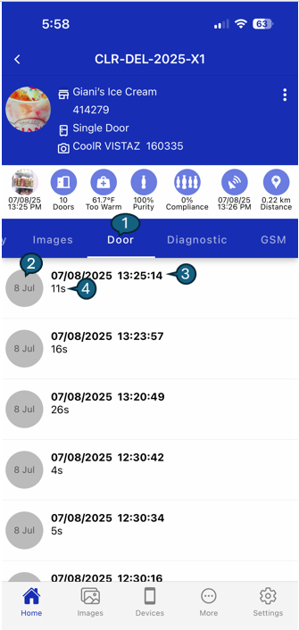 The Door tab provides a detailed, day-wise breakdown of all door-related events for the selected asset. It displays key metrics such as the number of door openings, the exact timestamps for each event, and the duration the door remained open. This enables users to monitor asset usage and analyze door activity patterns.
