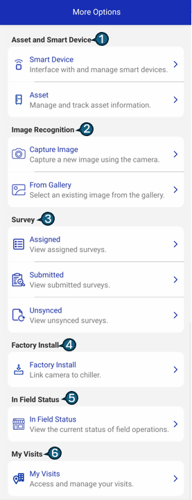 The More screen serves as a centralized hub that provides access to additional tools and features extending the core functionality of the application. It enables users to efficiently manage smart devices, assets, real-time image recognition, field activities, surveys, and visit data—helping streamline day-to-day workflows.