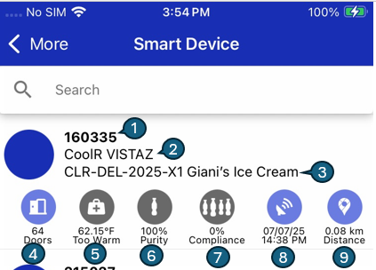 The Smart Device screen provides a detailed overview of CoolR smart devices, allowing users to monitor key metrics such as temperature, compliance, and connectivity status. This screen is essential for ensuring the operational efficiency and health of smart devices in various environments.