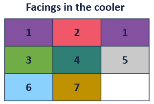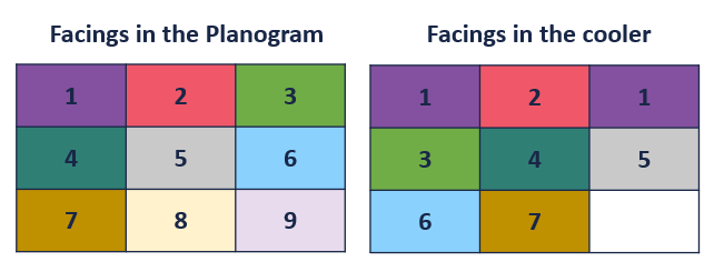 - Cooler has 9 facings, with 8 products, 1 of the products has 2 facings.