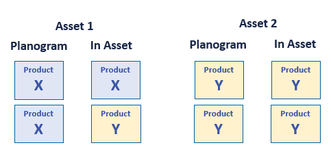 - Both assets have product Y in their planogram. Product Y is present in both assets (1 and 2).