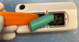 - Using your fingers, gently squeeze the metal clamps together to tighten the battery contact.