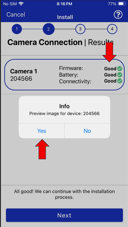 - Once connection is verified, proceed to capture the test image by choosing "Yes" from the info pop-up.