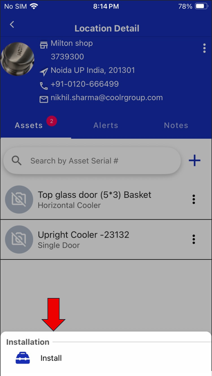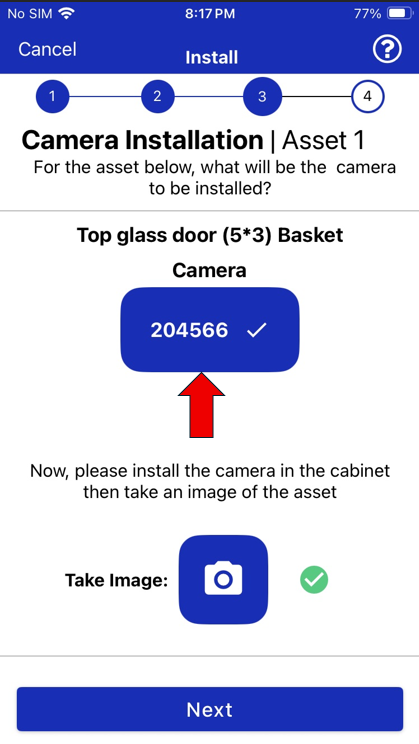 - Once the Asset is selected, tap on the "Install" option which shows up at the bottom of the screen to begin the camera installation process for that outlet & Asset